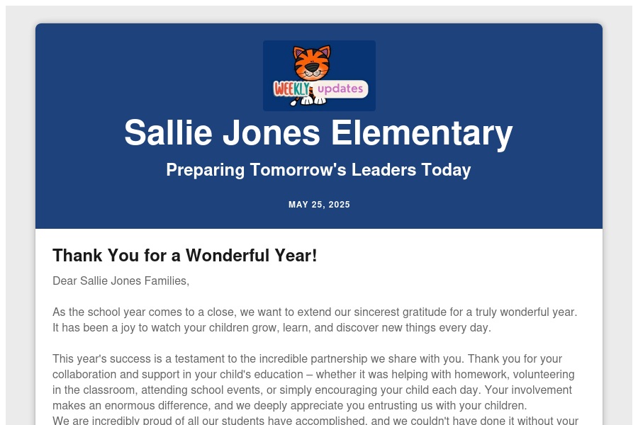 Sallie Jones Elementary School provides a supportive and stimulating learning environment where all students have the opportunity to reach their full potential and succeed.